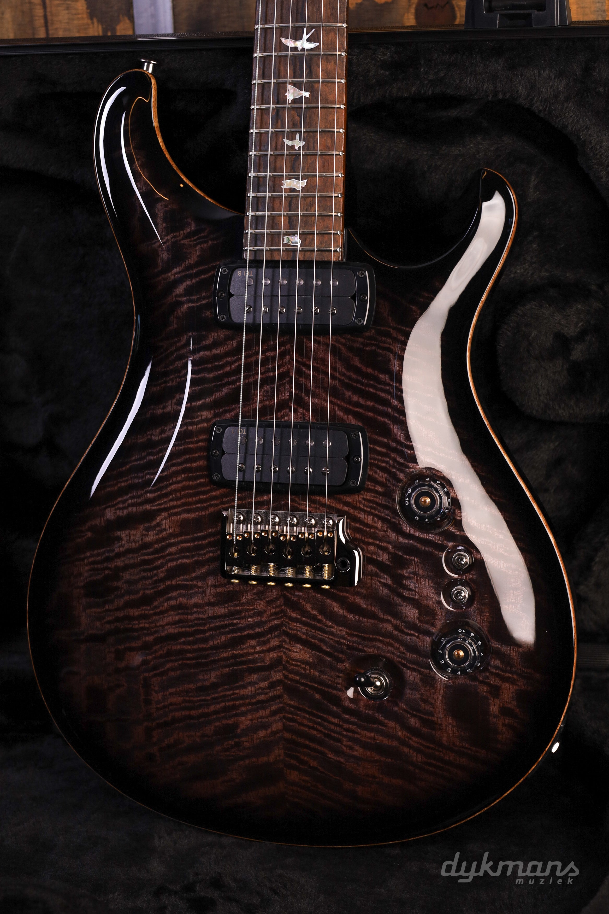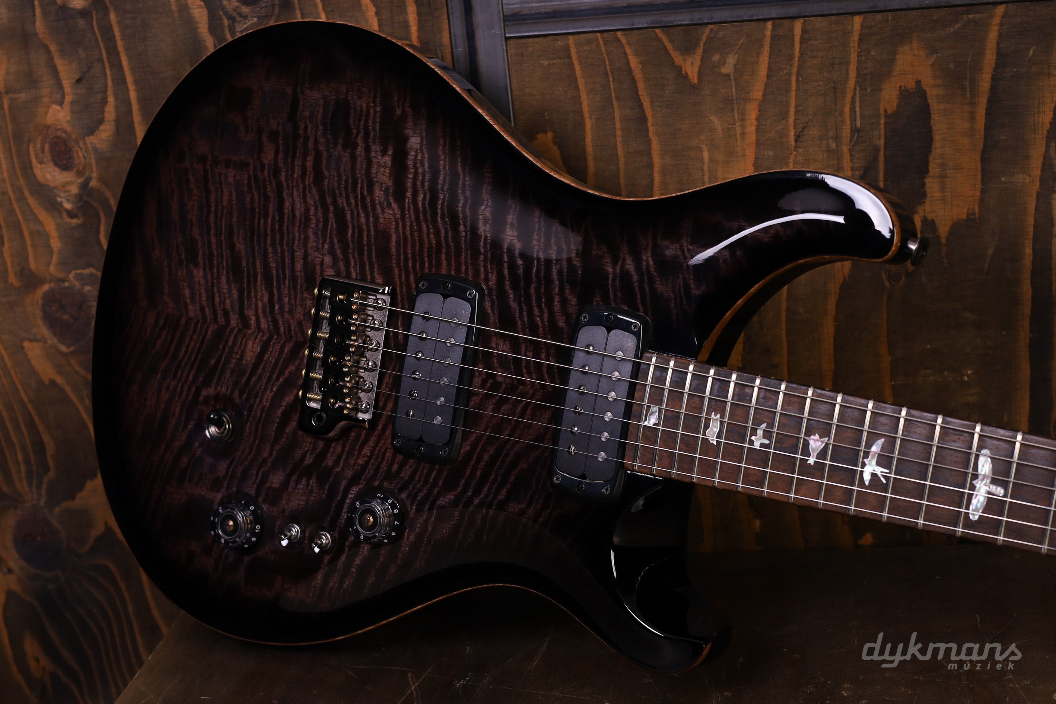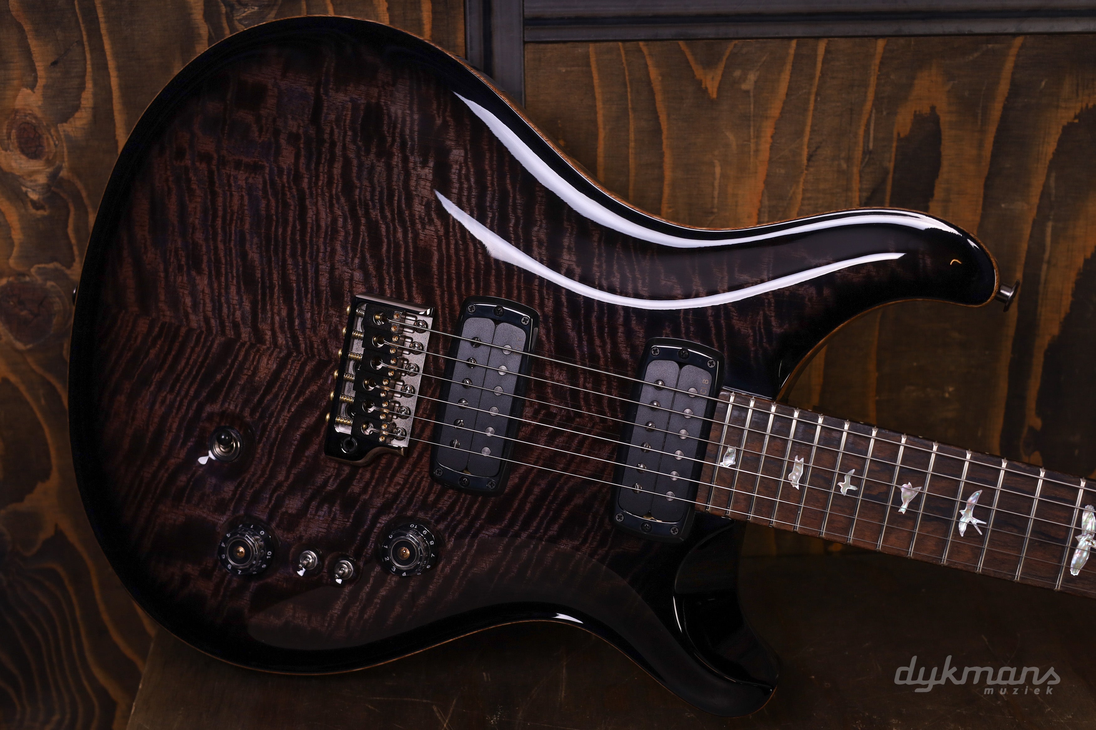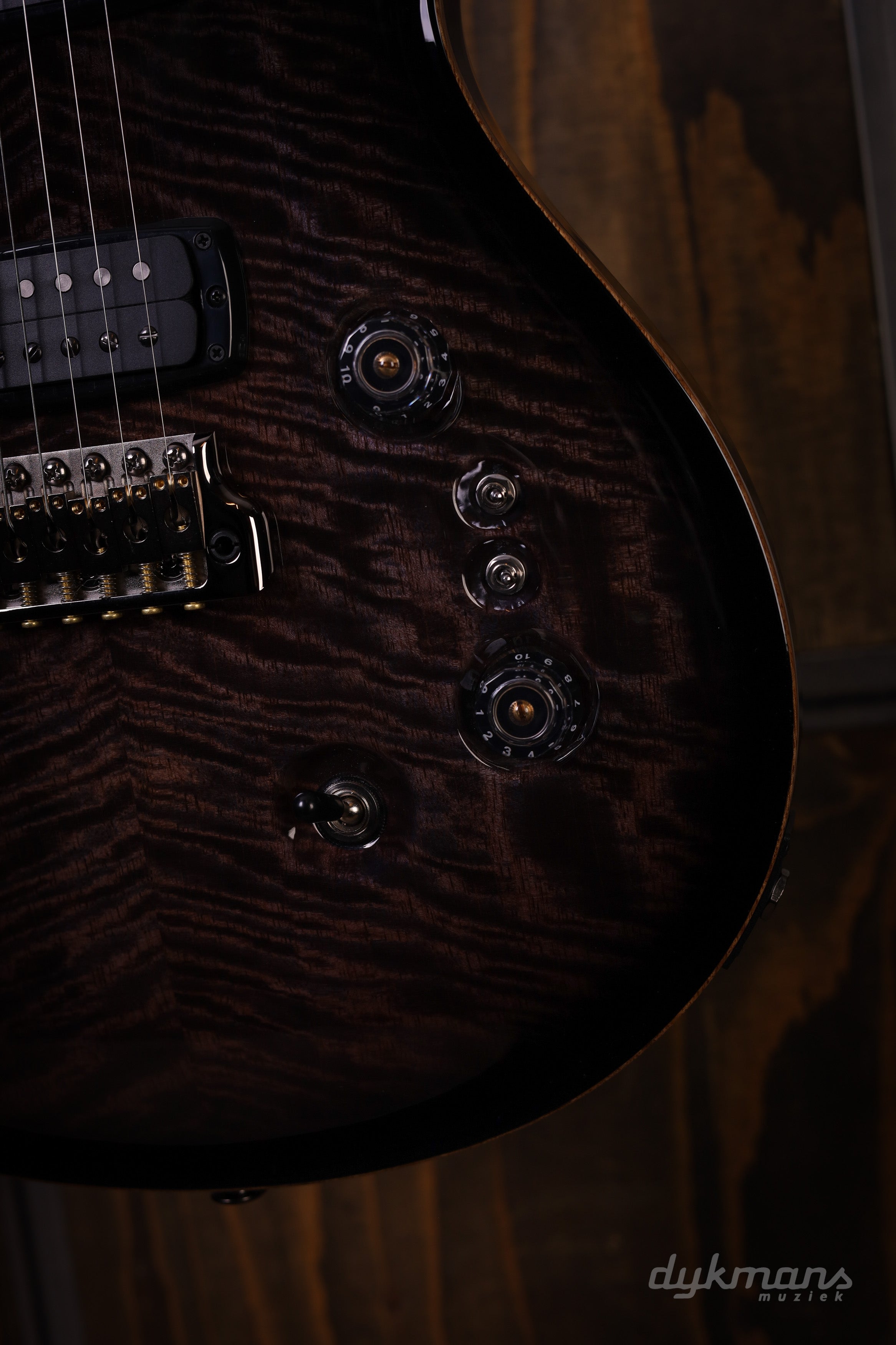 De basis is zoals je ’m kent: mahonie body en hals, 24 frets en een 25” mensuur. Speelt soepel, ligt lekker in de hand en voelt direct vertrouwd. De PRS Gen III tremolo en Phase III tuners met wing buttons zorgen ervoor dat alles stabiel blijft, ook als je de tremolo goed gebruikt.