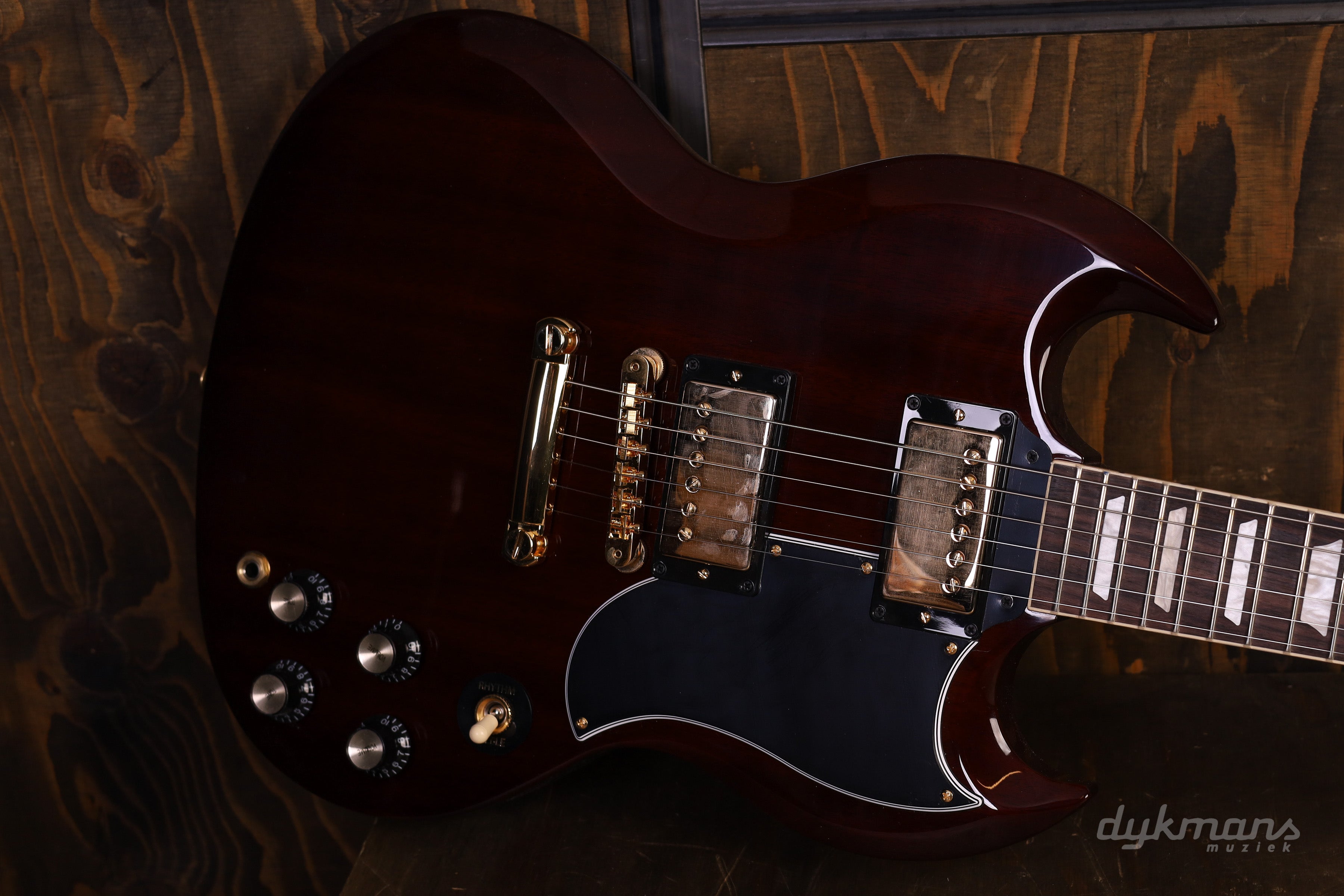 Een Gibson SG zoals je 'm vroeger kocht! Deze SG Standard '61 is helemaal periode-correct met precies de goede Aged Cherry finish, Burstbucker elementen voor dat authentieke P.A.F. geluid. Mooi bijkomend voordeel is dan ook dat deze Gibson SG Standard '61 te gek klinkt en heerlijk speelt. De Gibson SG Standard kent een grappige ontstaansgeschiedenis. In eerste instantie ging deze gitaar vanaf 1961 door het leven als de Gibson Les Paul... Huh? Inderdaad, dit model was bedoeld als de opvolger voor de zware Gibson Les Paul. Met slechts een dunne mahonie body was dit het antwoord op de klachten over het gewicht van de Les Paul. Maar er was een klein probleem. Mr. Les Paul himself vond de gitaar spuuglelijk en niet representatief voor zijn visie op de ultieme gitaar. Hierop besloot hij zijn naam niet meer te verlenen aan het model. Er moest dus een nieuwe naam komen, en zo geschiedde! De Gibson SG groeide uit tot een van de meest legendarische gitaren in de geschiedenis van rockmuziek. Denk aan grote namen als Angus Young, Eric Clapton, George Harrison, Duane Allman en meer recentelijk, Derek Trucks. Een Gibson SG heeft een zeer uitgesproken sound. Hij bijt, prikt goed door de muziek, en in de juist handen kan de gitaar zelfs zeer subtiel klinken. De Gibson SG is iconisch in elk opzicht en het is dan ook te gek dat deze gitaar nu ook weer verkrijgbaar is. De gitaar is afgewerkt in een klassieke Aged Cherry finish, en is uitgevoerd met een Slim Taper hals die erg fijn aanvoelt. Qua pickups is er gekozen voor de Burstbuckers, welke op een overtuigende manier het P.A.F. geluid reproduceren. De gitaar komt inclusief een prachtige hard shell case.