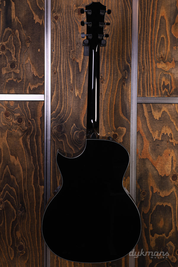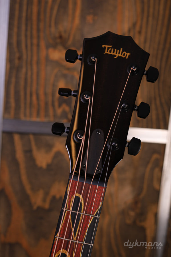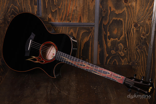Originally conceived as a custom shop order for a long-time Taylor player, the Hot Rod Guitar (HR-LTD) debuted as a NAMM Special Edition model in 2003 with curly maple back and sides and a Sitka spruce top. Featuring red and yellow inlaid wooden flames reaching down the fretboard toward the Florentine cutaway and encircling the soundhole in a ring of fire, the limited-edition guitar came in two versions: a black Jumbo and a Grand Auditorium with red back and sides and a natural top. This updated custom build presents the same inlay scheme and visual aesthetic as the original black model, but with a cutaway Grand Auditorium body and figured Big Leaf maple. Updates include satinwood yellow flame inlays and the bloodwood for the red purfling. Modern performance-focused enhancements include innovative V-Class interior voicing architecture, ES2 electronics and satin black tuners. It ships in a brown deluxe hardshell case.